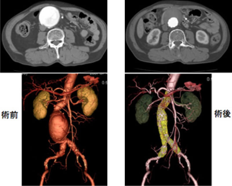 大動脈瘤が大きくなり破裂の危険性が高まってきた場合には、破裂する前に予防的に治療を行います。大動脈瘤の治療には人工血管に置換する手術やステントグラフトと呼ばれる骨組み付きの人工血管を血管内から挿入する治療があります。