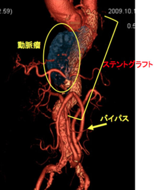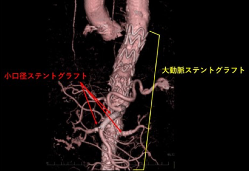 このような場合、あらかじめバイパス術を行った後にステントグラフトを内挿するハイブリッド治療が最も低侵襲な治療法です。また、ステントグラフトにその場で穴を開けて頭部の血流を維持する方法も取り入れています。